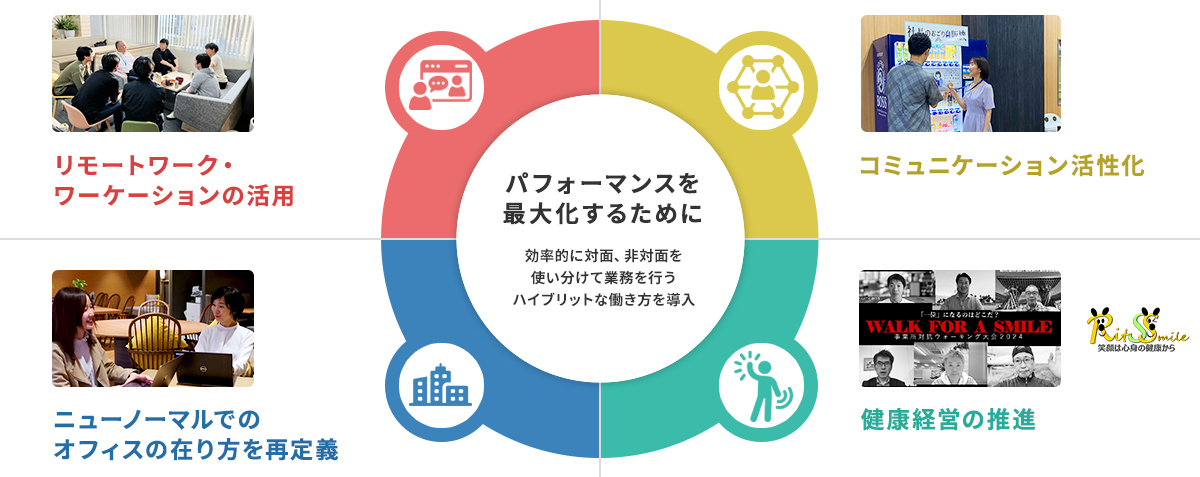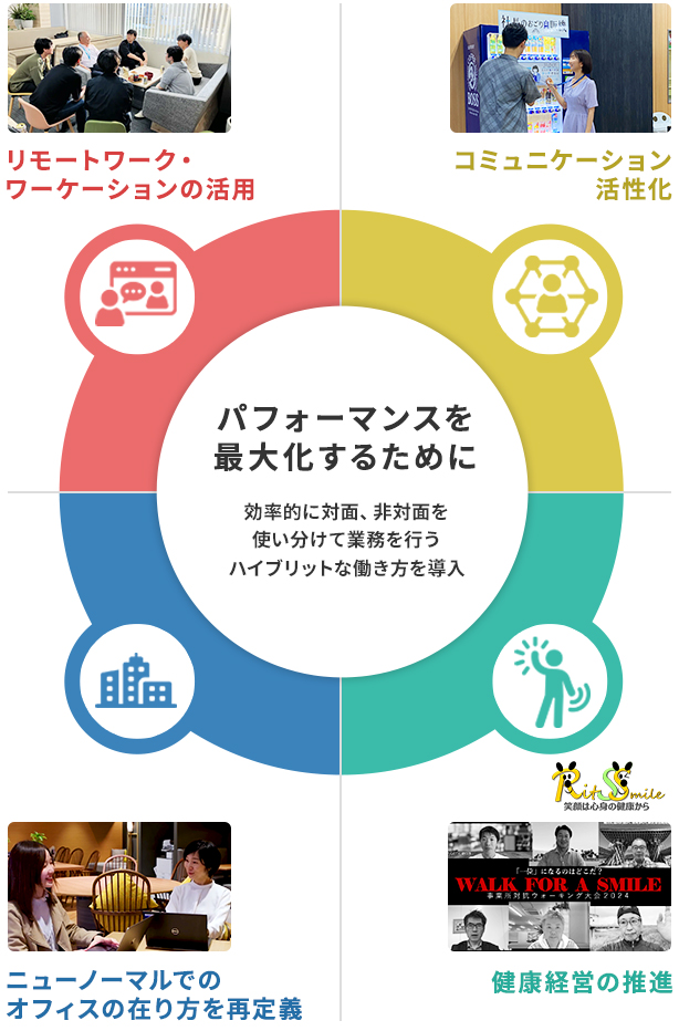 当社では、個人・組織それぞれの仕事内容に応じて、出社・リモートワークを選べるように取り組んでいます。時間や場所を選択できる柔軟な働き方を促進することで、 生産性や生活の質・健康の向上を図り、リコーが掲げる2036年ビジョン「“はたらく”に歓びを」を社員一人ひとりが実現することを目指します。